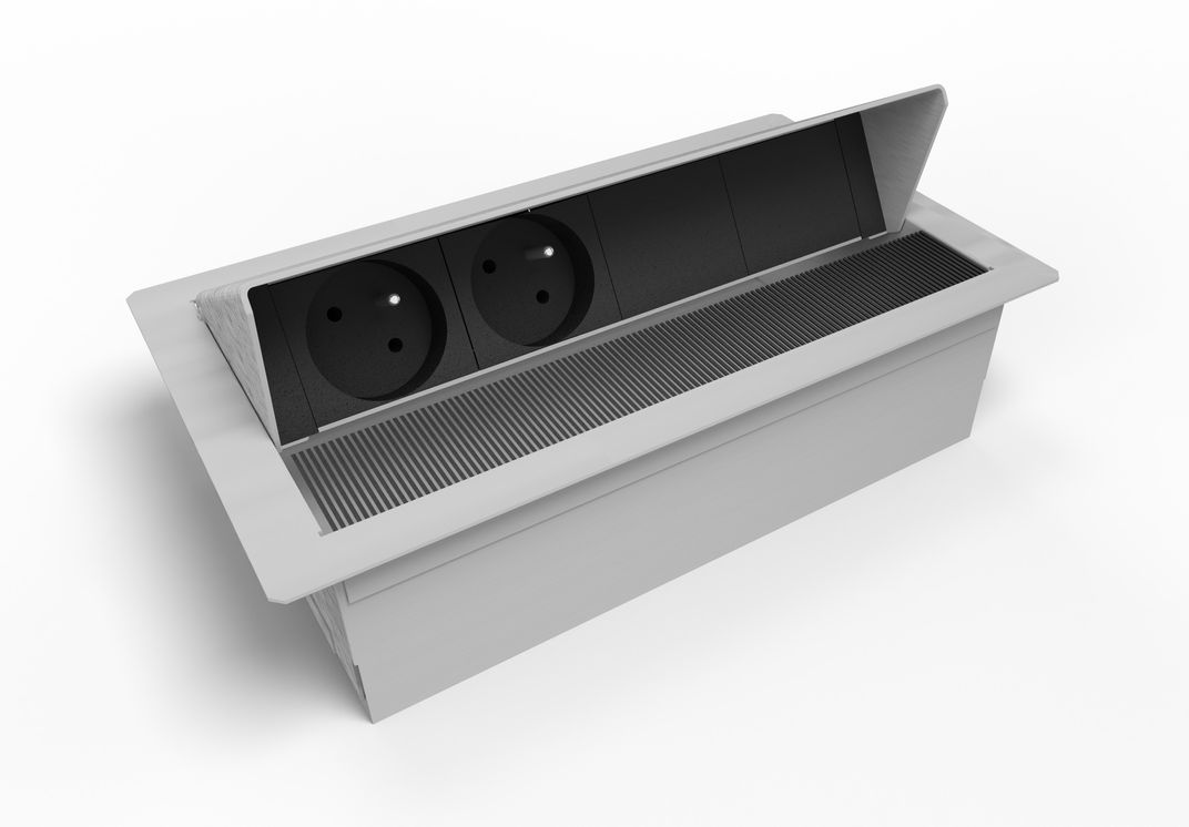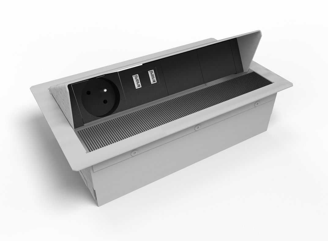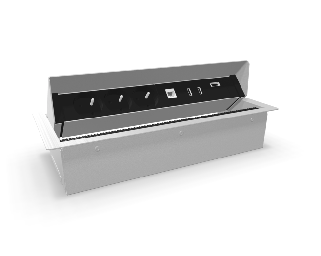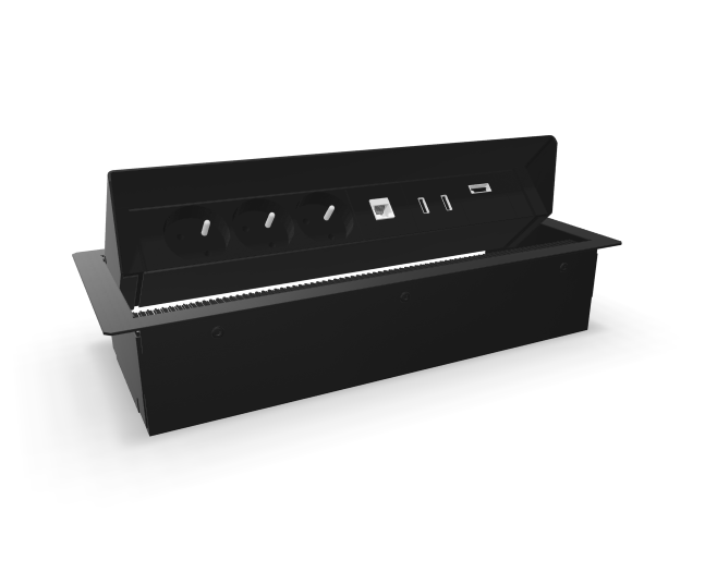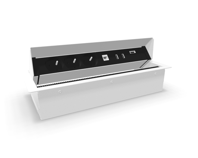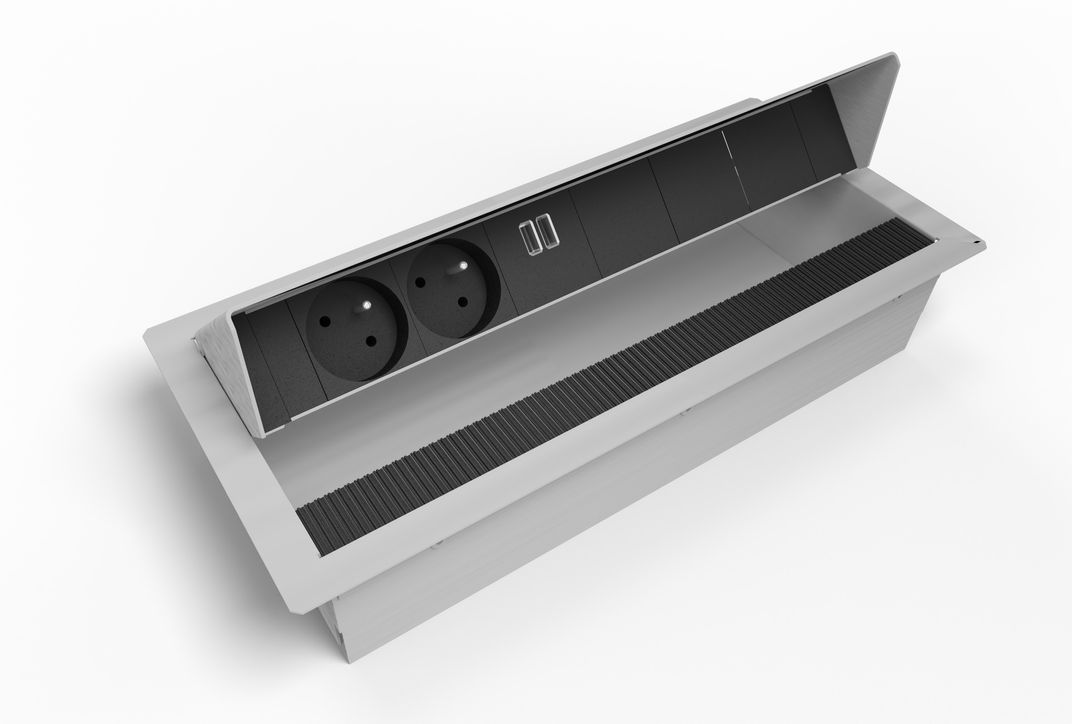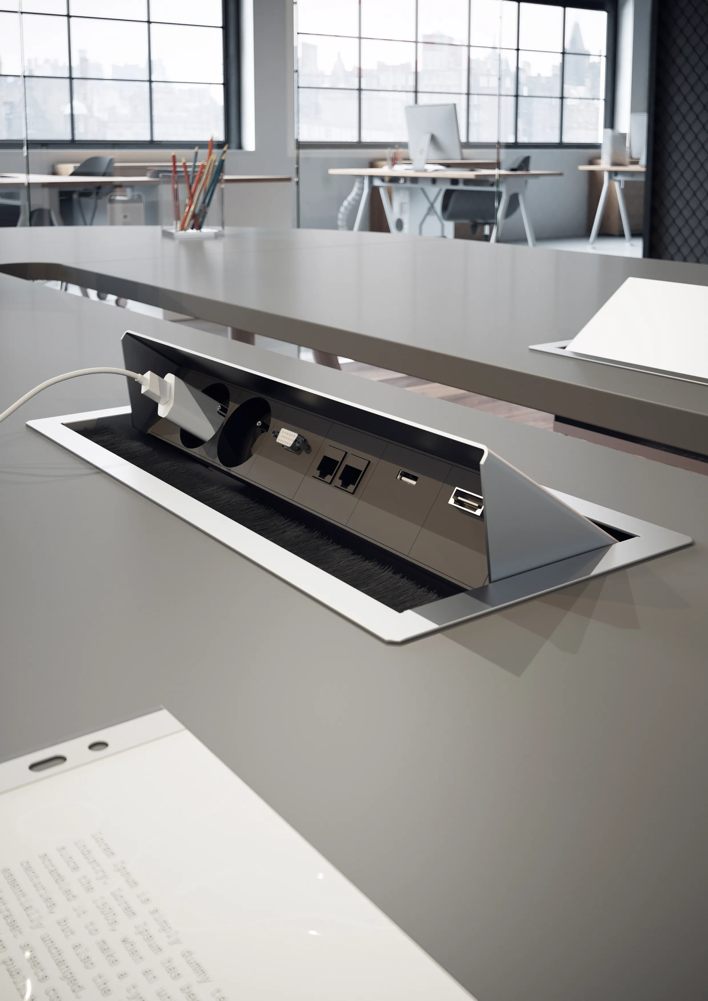 Dyskrecja i porządek: Otwierana kasetka maskuje złącza, dzięki czemu blat pozostaje czysty i uporządkowany. Kable są zawsze pod ręką, ale niewidoczne, gdy ich nie potrzebujesz.